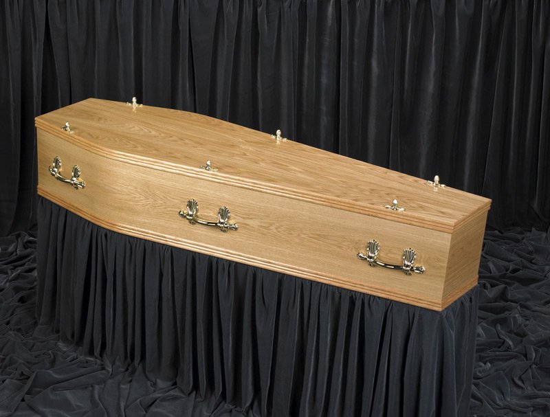 A light oak veneered coffin with a half round detail on the side and lid, together with double moulds. Fitted with brass plated handles, engraved name plate and a pure satin interior. - Chatsworth